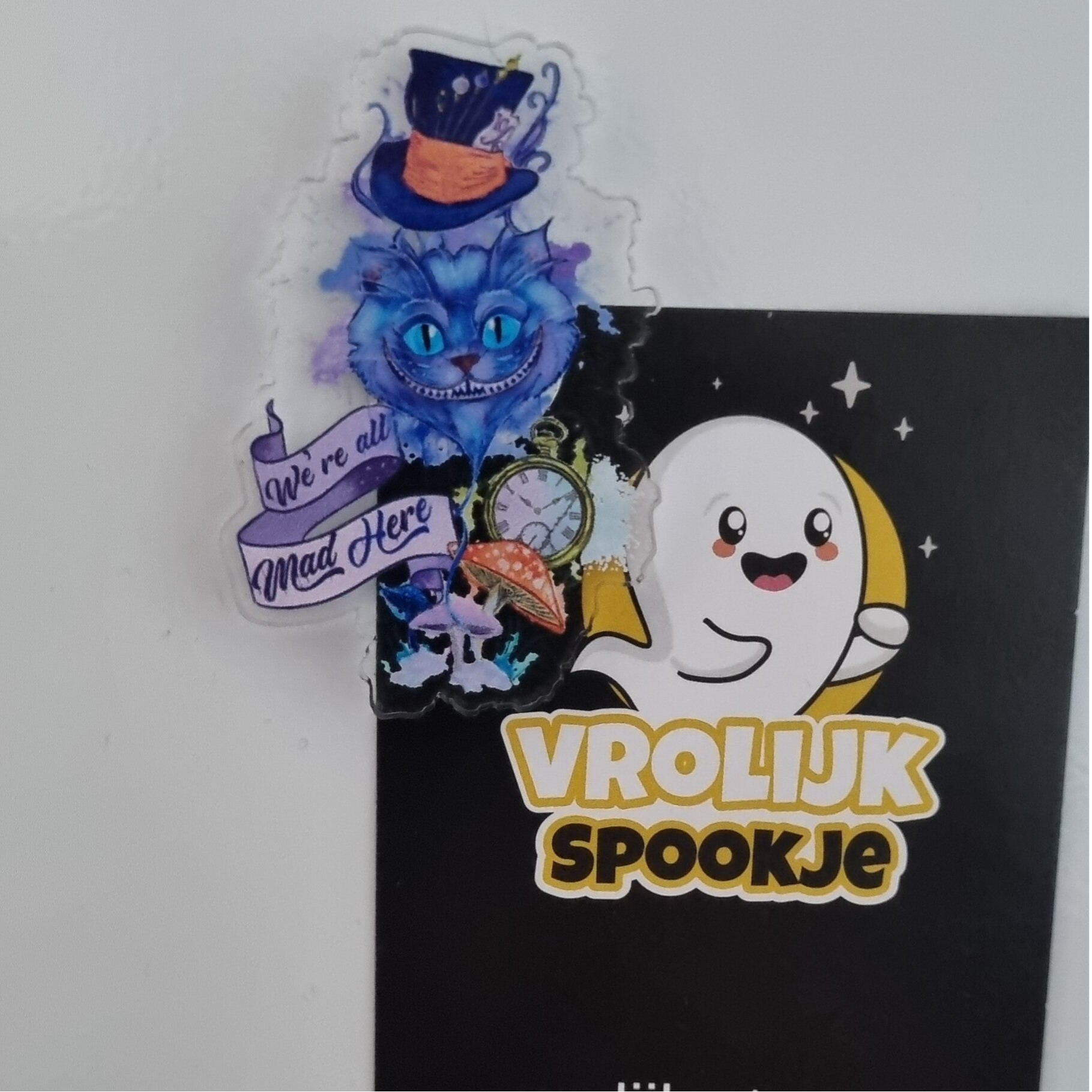 Deze We're All Mad Here magneet is een speelse en opvallende toevoeging aan je koelkast of magnetisch oppervlak. Geïnspireerd door de iconische quote uit Alice in Wonderland, weerspiegelt de magneet de gekte en speelsheid van de fantasiewereld. Met zijn opvallende design en stevige magneetkracht blijft hij goed zitten op je koelkast, magneetbord of ander metalen oppervlak. Gemaakt van duurzaam en krasbestendig materiaal, zodat hij lang mooi blijft. Perfect voor wie van een beetje eigenzinnigheid houdt of een creatieve touch wil toevoegen aan hun dagelijkse omgeving!
